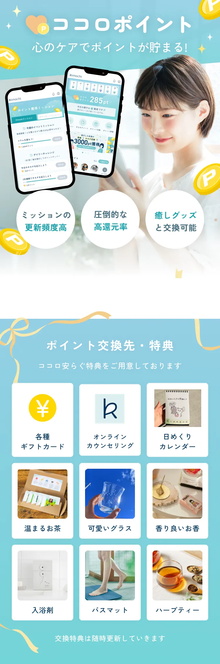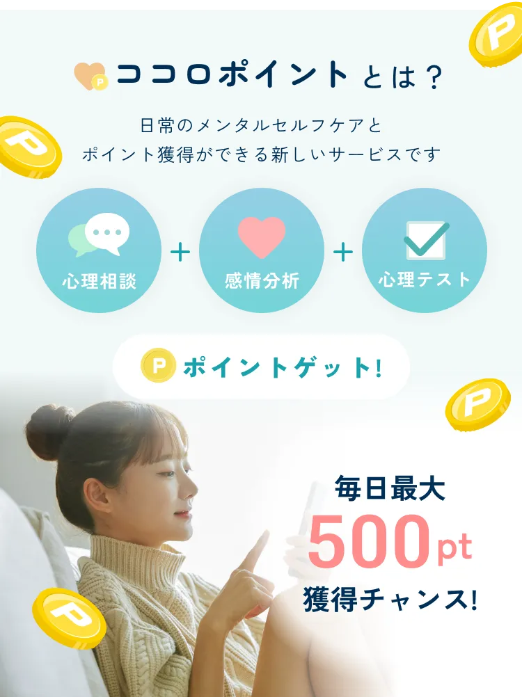 ココポは、日々のメンタルセルフチェックやカウンセリングの利用、アンケート回答などを通じてポイントを貯められるサービスです。 貯めたポイントは、さまざまな特典に交換することができます。