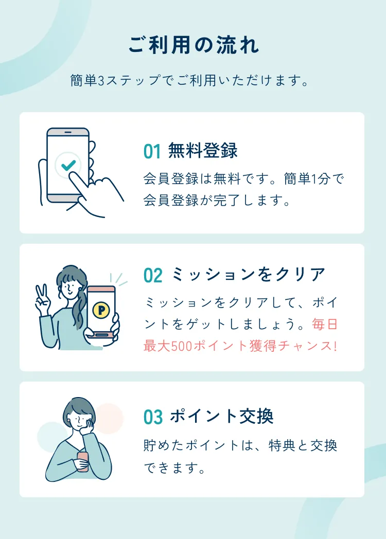 はい。セルフチェックや簡単なアンケート回答を行うことで、毎日コツコツとポイントを貯められます。 スキマ時間の活用におすすめです。