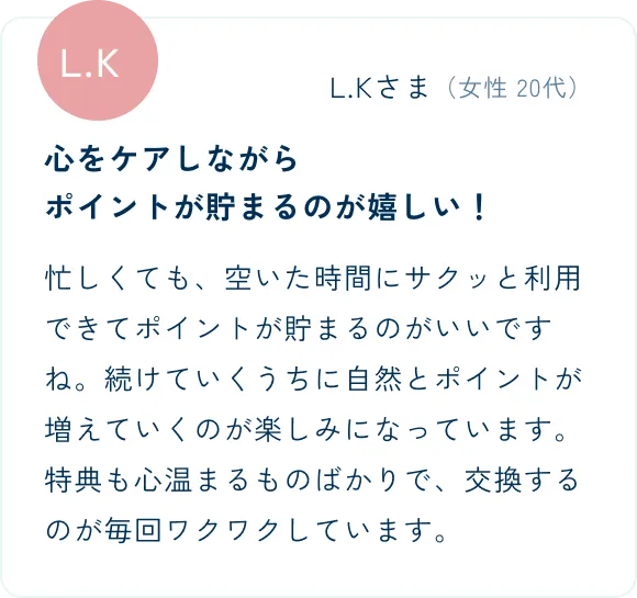 入浴剤やお茶、グラスなど、心をほっと和ませる特典をご用意しています。 日常のちょっとした楽しみやリラックスタイムにお使いいただけます。 今後も順次、交換できる特典を拡充していく予定です。